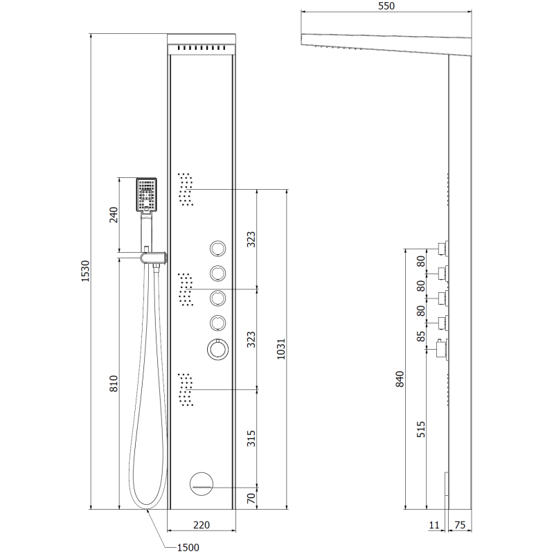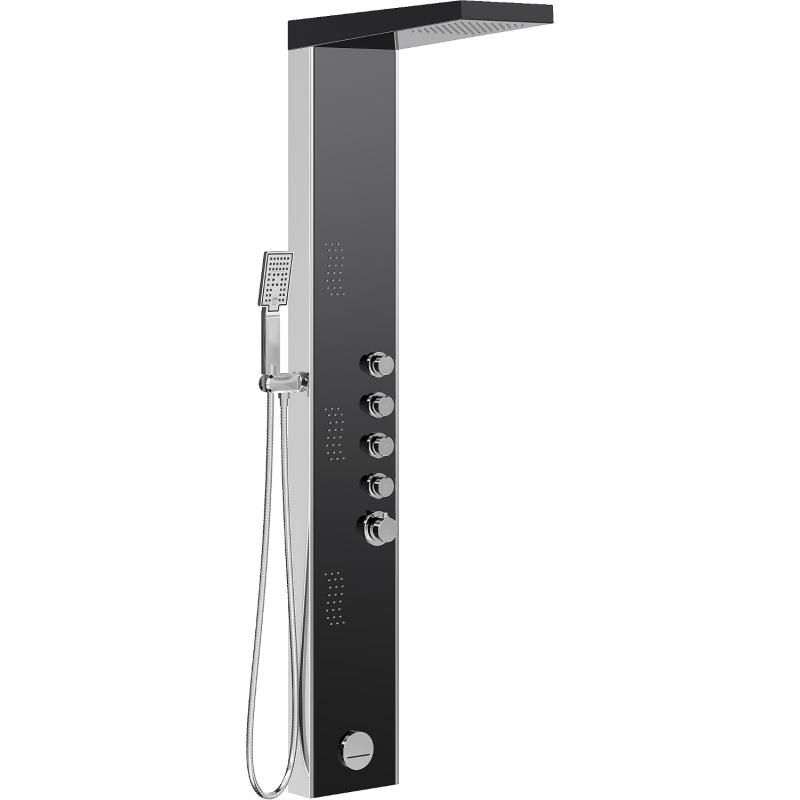 Specyfikacja produktu: Materiał: Stal nierdzewna Kolor: Czarny/Chrom Wysokość: 153 cm Szerokość: 22 cm Ilość funkcji: 4 Wylewka znajdująca się u dołu panela Zintegrowana deszczownica Słuchawka prysznicowa Wąż z osłoną ze stali nierdzewnej 150 cm Dysze silikonowe Anti-Calc ułatwiają usuwanie kamienia Brak możliwości regulacji ciśnienia wody, włączenie i wyłączenie strumienia z funkcją ON-OFF