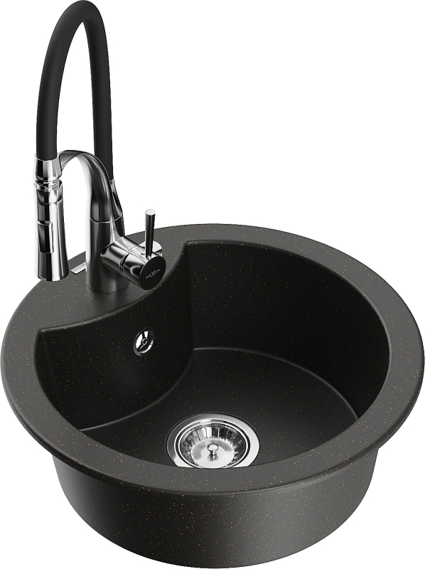 Mexen Diego 1miskový granitový dřez s kuchyňskou baterií Aster, černá/zlatá metalíza - 6512-75-73450-70
