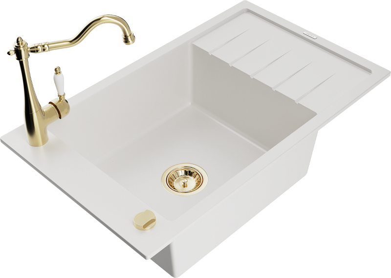 Mexen Elias 1-miskový granit dřez s odkapem a baterií Carla, bílá 6511-20-670700-50