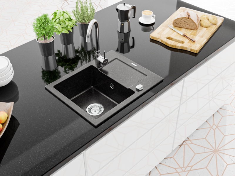 Mexen Enzo jednodřez granit s odkapem a baterií Telma, černá/stříbrná 6506-73-670200-00