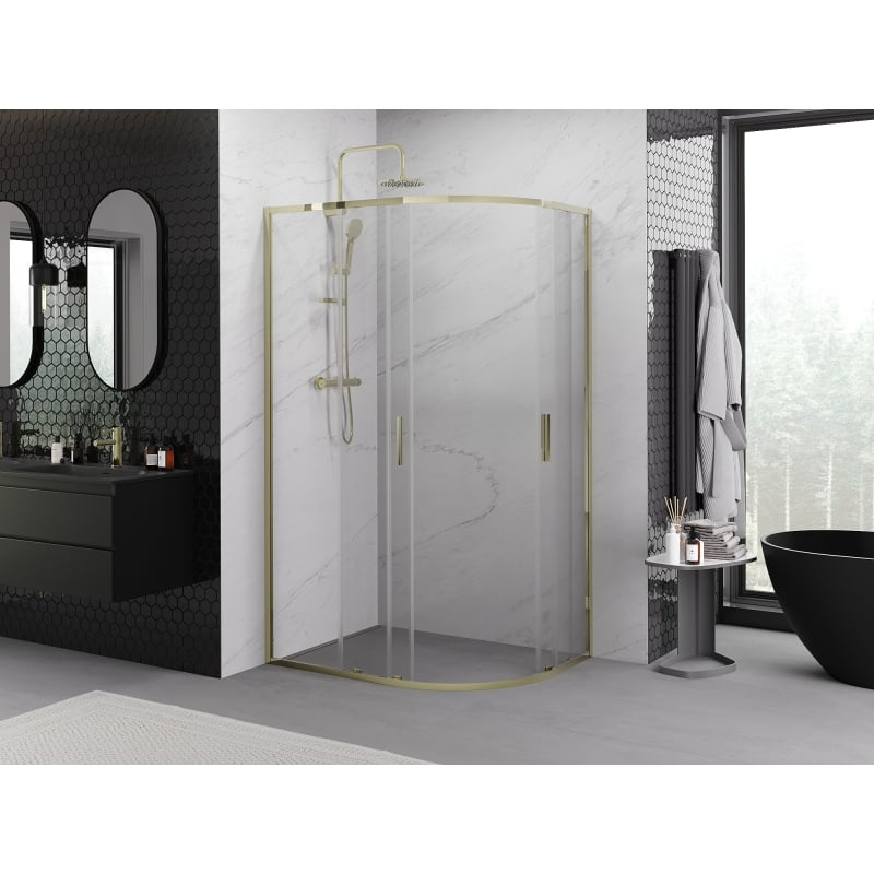 Specifikace produktu: Rozměr: 100x80 cm Výška: 200 cm Poloměr zakřivení R55 Montáž: Univerzální Vstup: Posuvné dveře Barva skla: Průhledná Povrchová úprava: Zlatá Typ skla: Tvrzené Tloušťka skla: 6 mm Profil: Hliník Povlak pro snadné čištění Vyrovnání nerovností stěny Nastavení šířky Možnost montáže na sprchovou vaničku nebo obklady Kovová rukojeť Sada těsnění pro odvod vody Hliníkový práh pro těsnění dveří