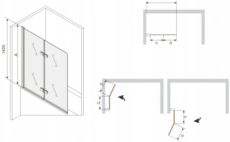 Mexen Felix vanová zástěna 2listá 100 x 140 cm, transparentní, zlatá - 890-100-002-50-00