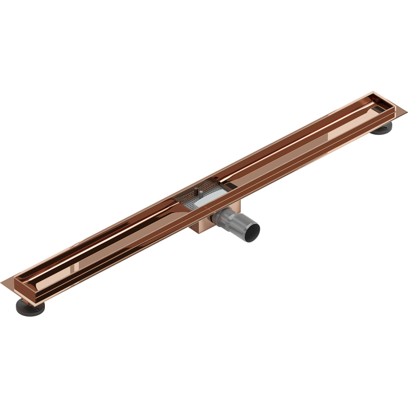 Dane techniczne: Materiał: Stal nierdzewna AISI 304 Wykończenie: Różowe złoto Szerokość: 100 cm Głębokość montażu: 52 mm Przepustowość: 50 l/min Do kompletowania z maskownicami M W zestawie: Stabilizatory montażu Regulowane nóżki Wyjmowany filtr zanieczyszczeń Kołnierz okalający - 2 cm Syfon zatrzymujący przykre zapachy Rynna odprowadzająca wodę Redukcja 50/40 mm