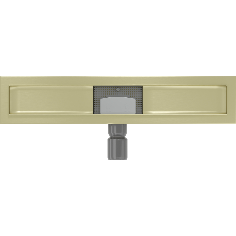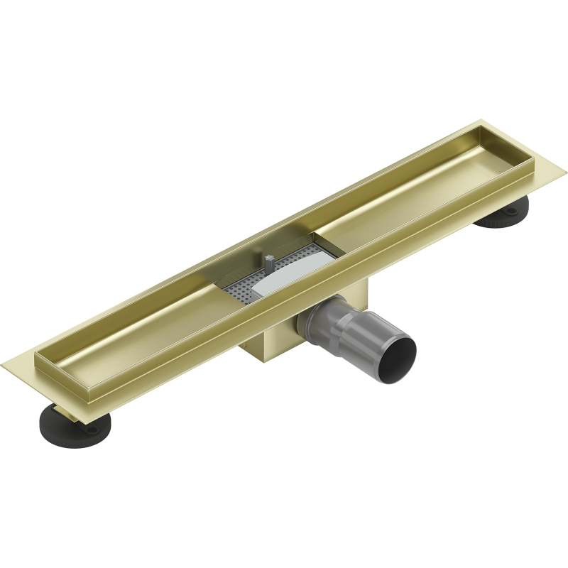 Dane techniczne: Materiał: Stal nierdzewna AISI 304 Wykończenie: Złoty szczotkowany Szerokość: 50 cm Głębokość montażu: 52 mm Przepustowość: 50 l/min Do kompletowania z maskownicami M W zestawie: Stabilizatory montażu Regulowane nóżki Wyjmowany filtr zanieczyszczeń Kołnierz okalający - 2 cm Syfon zatrzymujący przykre zapachy Rynna odprowadzająca wodę Redukcja 50/40 mm