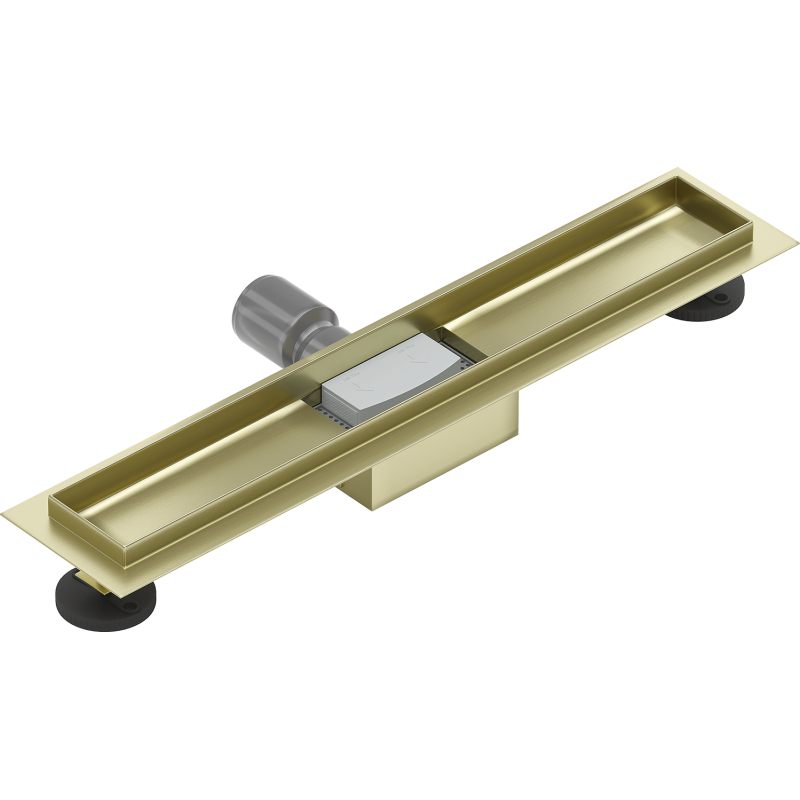 Dane techniczne: Materiał: Stal nierdzewna AISI 304 Wykończenie: Złoty szczotkowany Szerokość: 60 cm Głębokość montażu: 52 mm Przepustowość: 50 l/min Do kompletowania z maskownicami M W zestawie: Stabilizatory montażu Regulowane nóżki Wyjmowany filtr zanieczyszczeń Kołnierz okalający - 2 cm Syfon zatrzymujący przykre zapachy Rynna odprowadzająca wodę Redukcja 50/40 mm