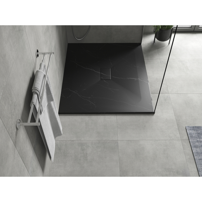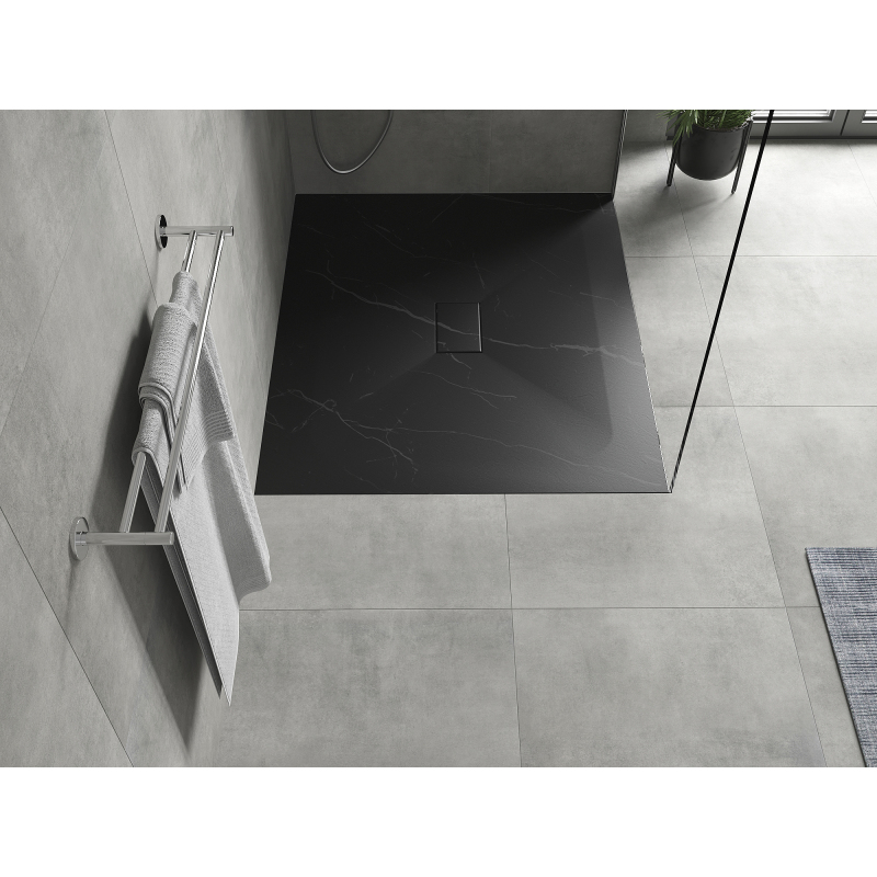 Dane techniczne: Rozmiar: 120x100x2,6 cm Kolor: Czarny kamień Typ: Prostokątny, Ultrapłaski Montaż: W posadzce lub na posadzce Materiał: SMC - tworzywo sztuczne Struktura kamienia Możliwość przycięcia brodzika Trwały produkt, który nie ulegnie deformacji Maksymalna stabilność dzięki dobrej odporności na uderzenia W komplecie syfon czyszczony od góry Średnica odpływu: 90 mm Wykończenie maskownicy: Czarny kamień Każdy brodzik posiada unikalny wzór naturalnego kamienia