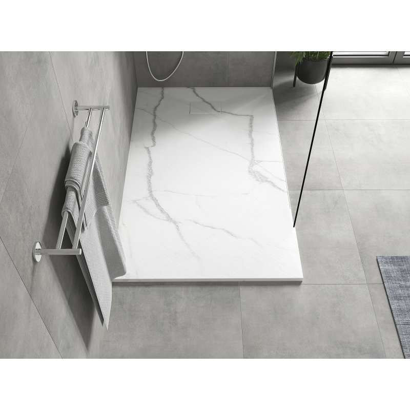 Dane techniczne: Rozmiar: 160x80x2,6 cm Kolor: Biały kamień Typ: Prostokątny, Ultrapłaski Montaż: W posadzce lub na posadzce Materiał: SMC - tworzywo sztuczne Struktura kamienia Możliwość przycięcia brodzika Trwały produkt, który nie ulegnie deformacji Maksymalna stabilność dzięki dobrej odporności na uderzenia W komplecie syfon czyszczony od góry Średnica odpływu: 90 mm Wykończenie maskownicy: Biały kamień Każdy brodzik posiada unikalny wzór naturalnego kamienia