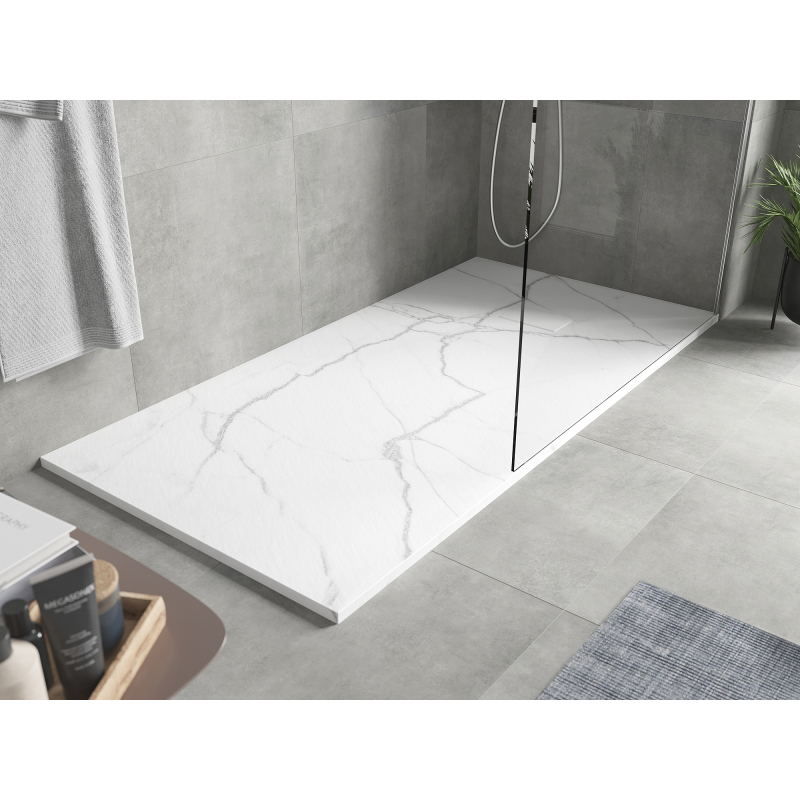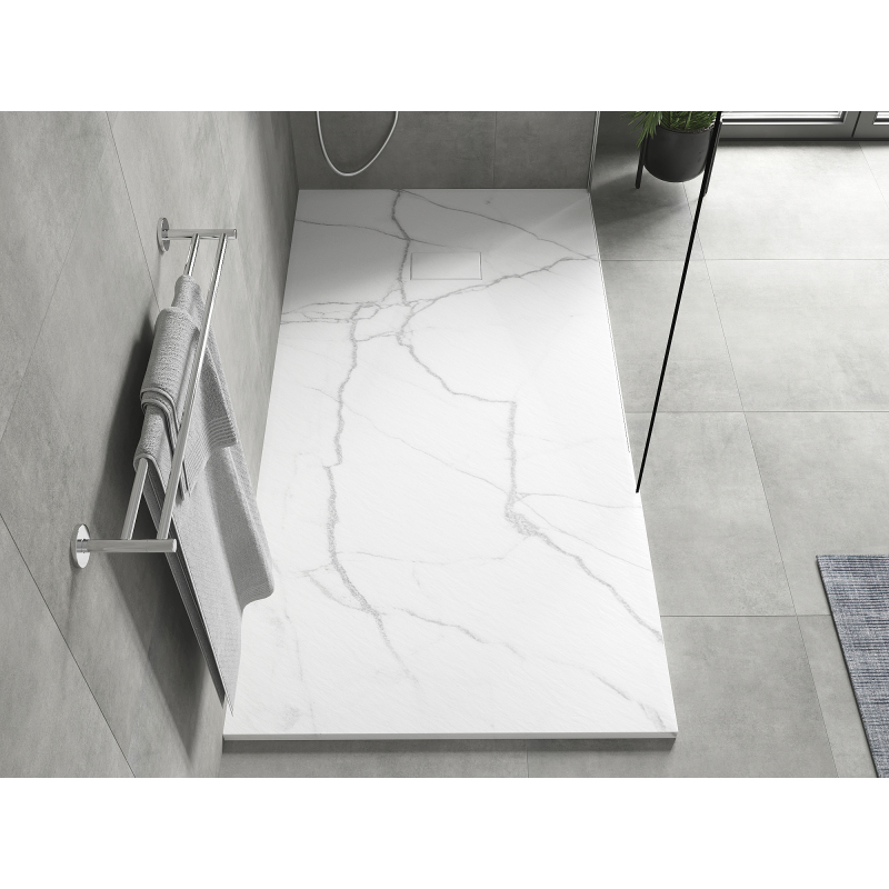 Dane techniczne: Rozmiar: 170x80x2,6 cm Kolor: Biały kamień Typ: Prostokątny, Ultrapłaski Montaż: W posadzce lub na posadzce Materiał: SMC - tworzywo sztuczne Struktura kamienia Możliwość przycięcia brodzika Trwały produkt, który nie ulegnie deformacji Maksymalna stabilność dzięki dobrej odporności na uderzenia W komplecie syfon czyszczony od góry Średnica odpływu: 90 mm Wykończenie maskownicy: Biały kamień Każdy brodzik posiada unikalny wzór naturalnego kamienia