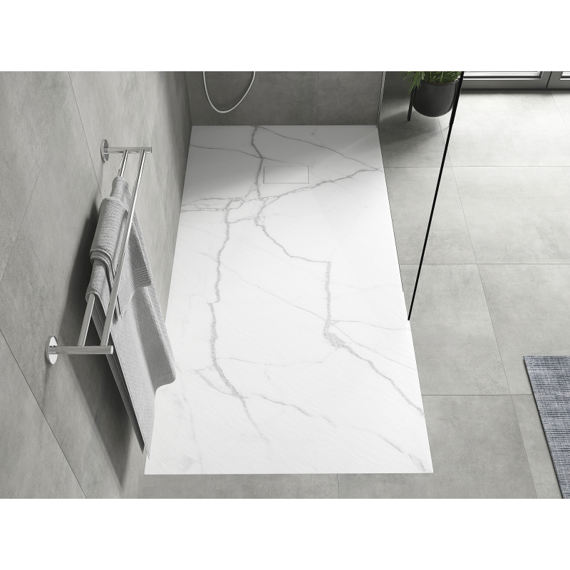 Dane techniczne: Rozmiar: 170x90x2,6 cm Kolor: Biały kamień Typ: Prostokątny, Ultrapłaski Montaż: W posadzce lub na posadzce Materiał: SMC - tworzywo sztuczne Struktura kamienia Możliwość przycięcia brodzika Trwały produkt, który nie ulegnie deformacji Maksymalna stabilność dzięki dobrej odporności na uderzenia W komplecie syfon czyszczony od góry Średnica odpływu: 90 mm Wykończenie maskownicy: Biały kamień Każdy brodzik posiada unikalny wzór naturalnego kamienia