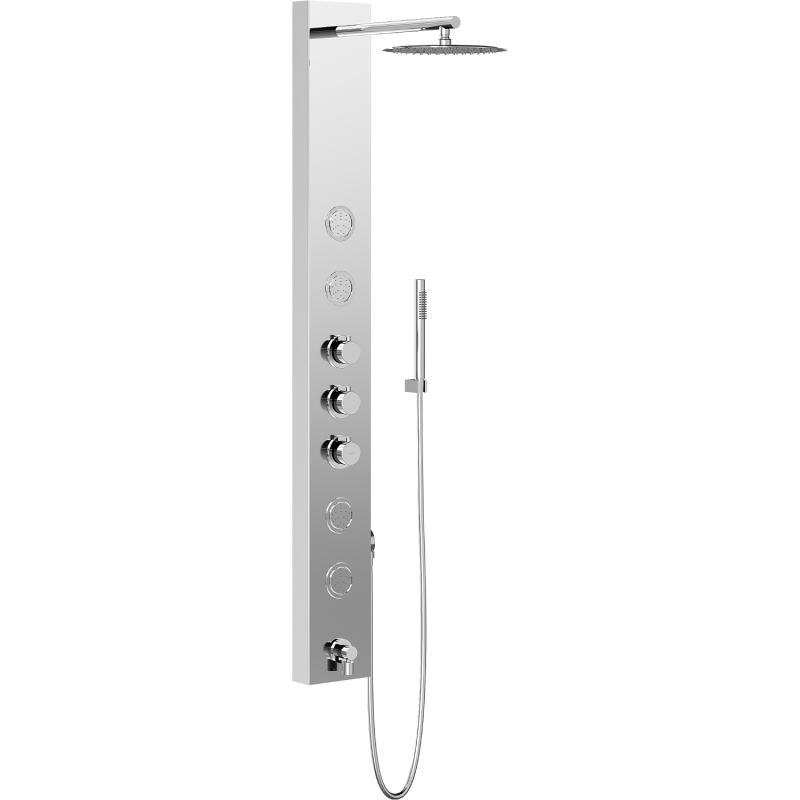Specyfikacja produktu: Materiał: Stal nierdzewna Kolor: Złoty Wysokość: 140 cm Szerokość: 16 cm Ilość funkcji: 4 Wylewka znajdująca się u dołu panela Deszczownica z możliwością regulacji kata nachylenia Słuchawka prysznicowa Wąż z osłoną ze stali nierdzewnej 150 cm Dysze silikonowe Anti-Calc ułatwiają usuwanie kamienia Brak możliwości regulacji ciśnienia wody, włączenie i wyłączenie strumienia z funkcją ON-OFF