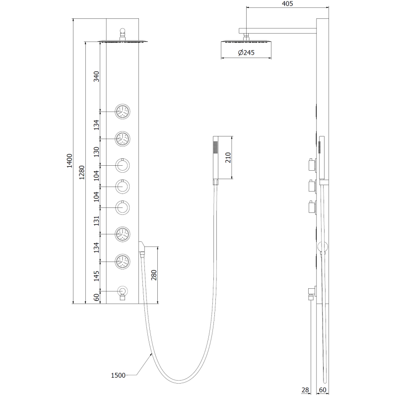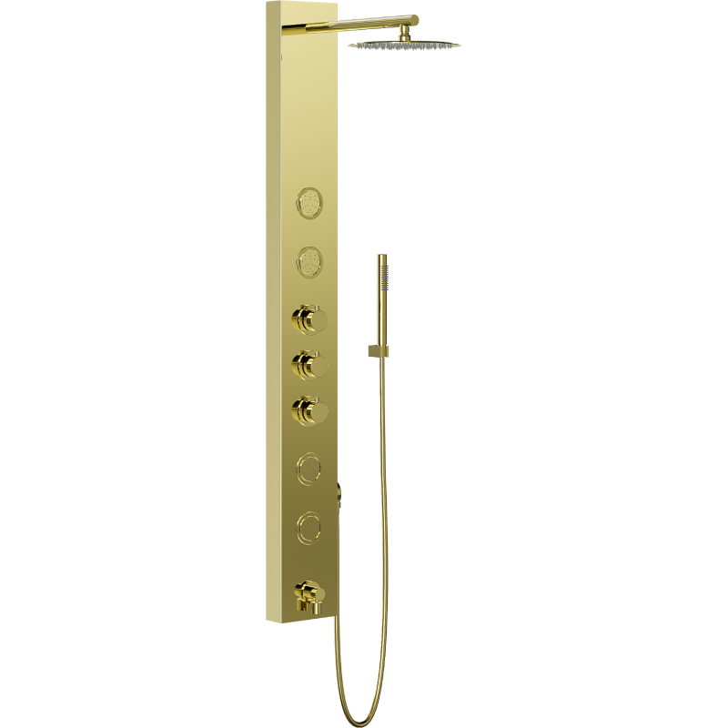 Specyfikacja produktu: Materiał: Stal nierdzewna Kolor: Złoty Wysokość: 140 cm Szerokość: 16 cm Ilość funkcji: 4 Wylewka znajdująca się u dołu panela Deszczownica z możliwością regulacji kata nachylenia Słuchawka prysznicowa Wąż z osłoną ze stali nierdzewnej 150 cm Dysze silikonowe Anti-Calc ułatwiają usuwanie kamienia Brak możliwości regulacji ciśnienia wody, włączenie i wyłączenie strumienia z funkcją ON-OFF