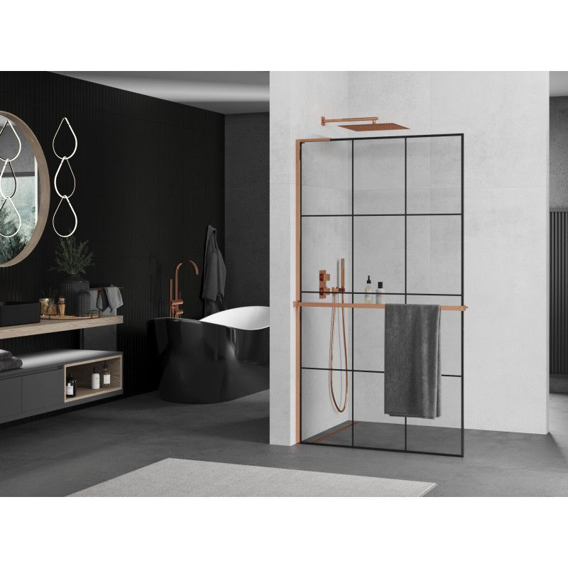 Specifikace produktu: Šířka: 120 cm Výška: 200 cm Montáž: Univerzální, pravá nebo levá Barva skla: Černá mřížka Povrchová úprava: Růžové zlato Typ skla: Tvrzené Tloušťka skla: 8 mm Profil: Hliník Úhlový stabilizátor ve tvaru L: Nerezová ocel Materiál police: Hliník Šířka: 12,9 cm Výška: 3,2 cm Max. délka police: 140 cm Možnost zkrácení police Povlak pro snadné čištění Vyrovnání nerovností stěny Možnost instalace na sprchovou vaničku nebo obklady