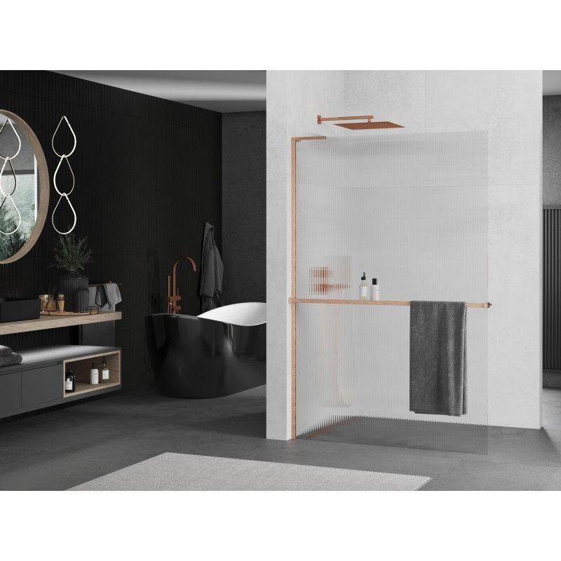 Specifikace produktu: Šířka: 70 cm Výška: 200 cm Montáž: Univerzální, pravá nebo levá Barva skla: Pruhovaná Povrchová úprava: Kartáčovaná měď Typ skla: Tvrzené Tloušťka skla: 8 mm Profil: Hliník Stabilizátor ve tvaru L: Nerezová ocel Materiál police: Hliník Šířka: 12,9 cm Výška: 3,2 cm Max. délka police: 140 cm Možnost zkrácení police Povlak pro snadné čištění Vyrovnání nerovností stěny Možnost instalace na sprchovou vaničku nebo obklady