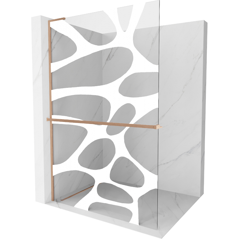 Specifikace produktu: Šířka: 80 cm Výška: 200 cm Montáž: Univerzální, pravá nebo levá Barva skla: Bílá vlna Povrchová úprava: Kartáčovaná měď Typ skla: Tvrzené Tloušťka skla: 8 mm Profil: Hliník Úhlový stabilizátor ve tvaru L: Nerezová ocel Materiál police: Hliník Šířka: 12,9 cm Výška: 3,2 cm Max. délka police: 140 cm Možnost zkrácení police Povlak pro snadné čištění Vyrovnání nerovností stěny Možnost instalace na sprchovou vaničku nebo obklady