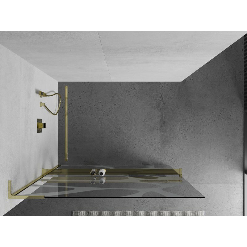 Specifikace produktu: Šířka: 80 cm Výška: 200 cm Montáž: Univerzální, pravá nebo levá Barva skla: Bílá vlna Povrchová úprava: Zlatá Typ skla: Tvrzené Tloušťka skla: 8 mm Profil: Hliník Úhlový stabilizátor ve tvaru L: Nerezová ocel Materiál police: Hliník Šířka: 12,9 cm Výška: 3,2 cm Max. délka police: 140 cm Možnost zkrácení police Povlak pro snadné čištění Vyrovnání nerovností stěny Možnost instalace na sprchovou vaničku nebo obklady