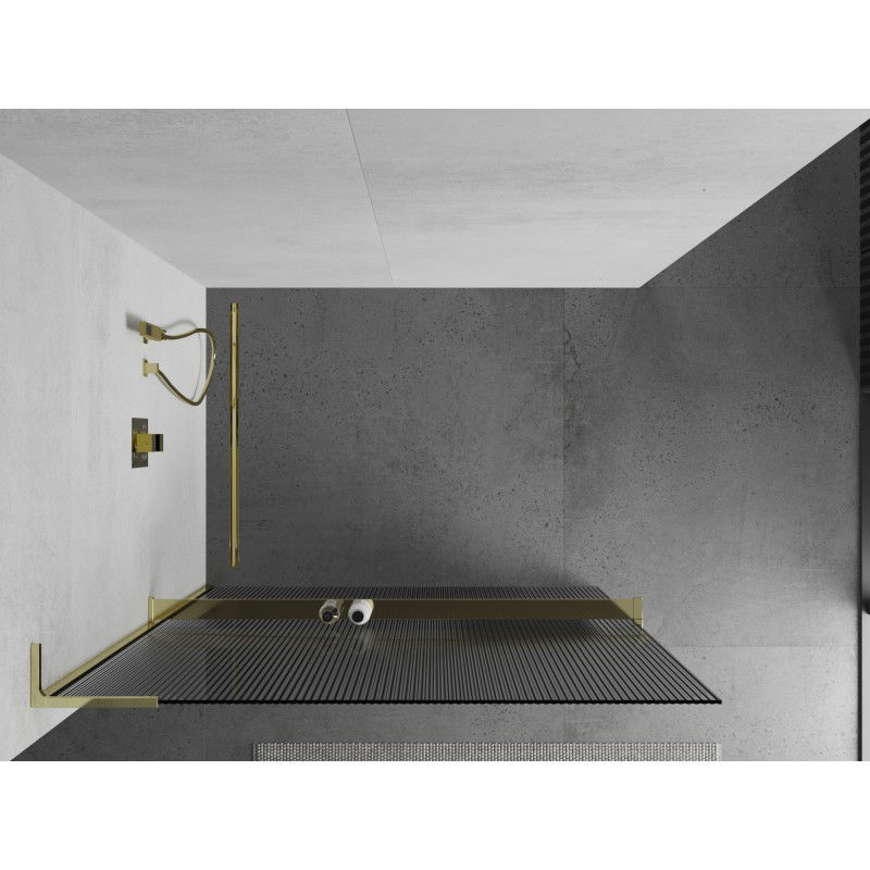 Specifikace produktu: Šířka: 80 cm Výška: 200 cm Montáž: Univerzální, pravá nebo levá Barva skla: Pruhované Povrchová úprava: Zlatá Typ skla: Tvrzené Tloušťka skla: 8 mm Profil: Hliník Úhlový stabilizátor ve tvaru L: Nerezová ocel Materiál police: Hliník Šířka: 12,9 cm Výška: 3,2 cm Max. délka police: 140 cm Možnost zkrácení police Povlak pro snadné čištění Vyrovnání nerovností stěny Možnost instalace na sprchovou vaničku nebo obklady