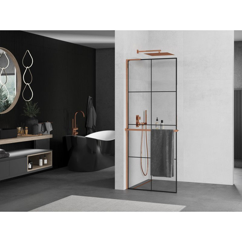Specifikace produktu: Šířka: 90 cm Výška: 200 cm Montáž: Univerzální, pravá nebo levá Barva skla: Černá mřížka Povrchová úprava: Růžové zlato Typ skla: Tvrzené Tloušťka skla: 8 mm Profil: Hliník Úhlový stabilizátor ve tvaru L: Nerezová ocel Materiál police: Hliník Šířka: 12,9 cm Výška: 3,2 cm Max. délka police: 140 cm Možnost zkrácení police Povlak pro snadné čištění Vyrovnání nerovností stěny Možnost instalace na sprchovou vaničku nebo obklady