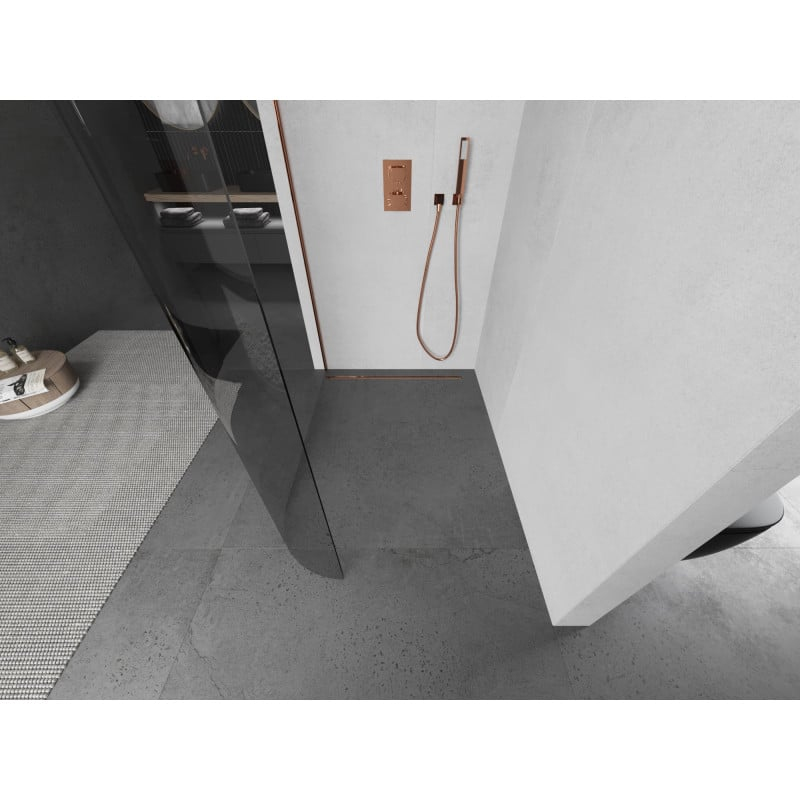 Technické údaje: Šířka: 100 cm Výška: 200 cm Montáž: Univerzální, pravá nebo levá Barva skla: Průhledná Povrchová úprava: Růžové zlato Typ skla: Tvrzené Tloušťka skla: 8 mm Profil: Hliník Konzola: Nerezová ocel Max. délka konzoly: 150 cm Konzolu lze zkrátit Povrchová úprava pro snadné čištění Vyrovnání nerovností stěny Možnost montáže na sprchovou vaničku nebo dlaždice