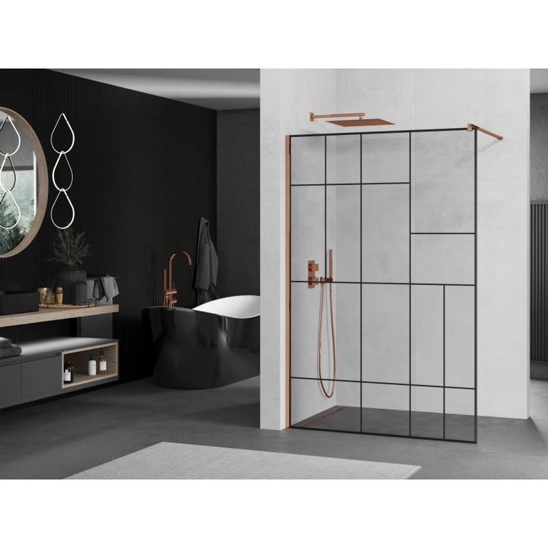 Specifikace produktu: Šířka: 120 cm Výška: 200 cm Montáž: Univerzální, pravá nebo levá Barva skla: Černý vzor Povrchová úprava: Růžové zlato Typ skla: Tvrzené Tloušťka skla: 8 mm Profil: Hliník Konzola: Nerezová ocel Max. délka konzoly: 150 cm Konzolu lze zkrátit Povrchová úprava pro snadné čištění Vyrovnává nerovnosti stěny Možnost montáže na sprchovou vaničku nebo dlaždice