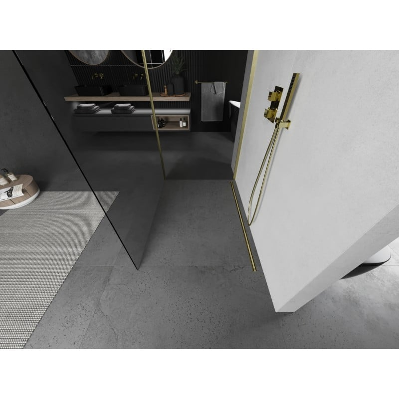 Specifikace produktu: Šířka: 135x110 cm (stěna X - 135 cm, stěna Y - 110 cm) Výška: 200 cm Montáž: Univerzální Barva skla: Průhledná Povrchová úprava: Kartáčované zlato Typ skla: Tvrzené Tloušťka skla: 8 mm Profil: Hliník Konzola: Nerezová ocel Max. délka konzoly: 150 cm Konzolu lze zkrátit Povrchová úprava pro snadné čištění Vyrovnání nerovností stěny Možnost instalace na sprchovou vaničku nebo obklady