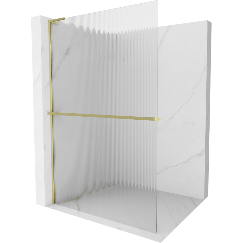 Specifikace produktu: Šířka: 100 cm Výška: 200 cm Montáž: Univerzální, pravá nebo levá Barva skla: Pruhované Povrchová úprava: Kartáčované zlato Typ skla: Tvrzené Tloušťka skla: 8 mm Profil: Hliník Úhlový stabilizátor ve tvaru L: Nerezová ocel Materiál police: Hliník Šířka: 12,9 cm Výška: 3,2 cm Max. délka police: 140 cm Možnost zkrácení police Povlak pro snadné čištění Vyrovnání nerovností stěny Možnost instalace na sprchovou vaničku nebo obklady
