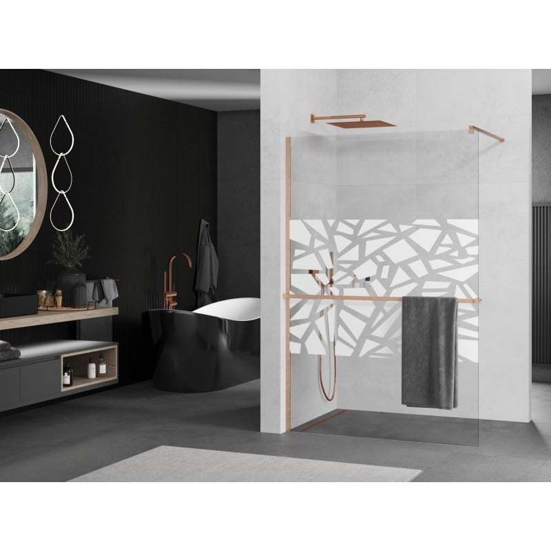 Specifikace produktu: Šířka: 100 cm Výška: 200 cm Montáž: Univerzální, pravá nebo levá Barva skla: Bílý vzor Povrchová úprava: Kartáčovaná měď Typ skla: Tvrzené Tloušťka skla: 8 mm Profil: Hliník Konzola: Nerezová ocel Max. délka konzoly: 150 cm Materiál police: Hliník Šířka: 12,9 cm Výška: 3,2 cm Max. délka police: 140 cm Možnost zkrácení konzoly a police Povlak pro snadné čištění Vyrovnání nerovností stěn Možnost montáže na sprchovou vaničku nebo obklady