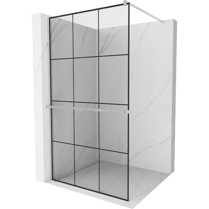 Specifikace produktu: Šířka: 100 cm Výška: 200 cm Montáž: Univerzální, pravá nebo levá Barva skla: Černá mřížka Povrchová úprava: Kartáčovaný nikl Typ skla: Tvrzené Tloušťka skla: 8 mm Profil: Hliník Konzola: Nerezová ocel Max. délka konzoly: 150 cm Materiál police: Hliník Šířka: 12,9 cm Výška: 3,2 cm Max. délka police: 140 cm Konzolu a poličku lze oříznout Povrchová úprava pro snadné čištění Vyrovnává nerovnosti stěny Lze namontovat na sprchovou vaničku nebo dlaždice