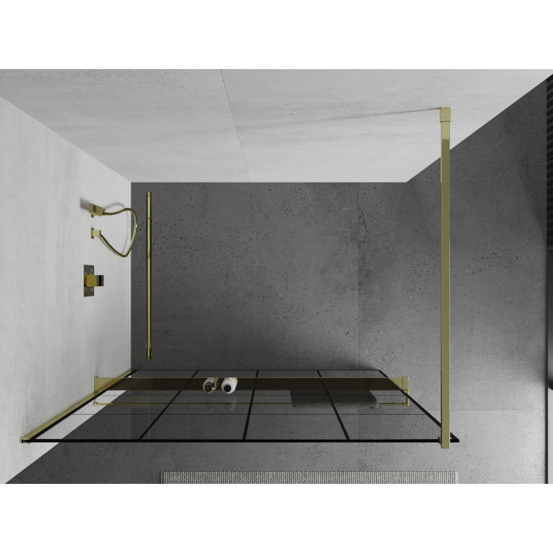 Mexen Kioto+ Sprchová zástěna s policí 130 x 200 cm, černá mřížka, zlatá - 800-130-121-50-77