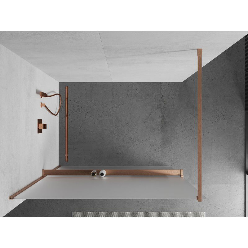 Specifikace produktu: Šířka: 140 cm Výška: 200 cm Montáž: Univerzální, pravá nebo levá Barva skla: Mléčná Povrchová úprava: Kartáčovaná měď Typ skla: Tvrzené Tloušťka skla: 8 mm Profil: Hliník Konzola: Nerezová ocel Max. délka konzoly: 150 cm Materiál police: Hliník Šířka: 12,9 cm Výška: 3,2 cm Max. délka police: 140 cm Konzolu a poličku lze oříznout Povrchová úprava pro snadné čištění Vyrovnává nerovnosti stěny Lze namontovat na sprchovou vaničku nebo dlaždice