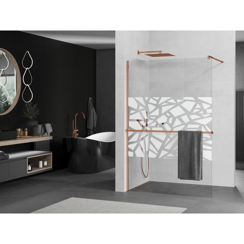 Specifikace produktu: Šířka: 100 cm Výška: 200 cm Montáž: Univerzální, pravá nebo levá Barva skla: Bílý vzor Povrchová úprava: Růžové zlato Typ skla: Tvrzené Tloušťka skla: 8 mm Profil: Hliník Konzola: Nerezová ocel Max. délka konzoly: 150 cm Materiál police: Hliník Šířka: 12,9 cm Výška: 3,2 cm Max. délka police: 140 cm Konzolu a poličku lze oříznout Povrchová úprava pro snadné čištění Vyrovnává nerovnosti stěny Lze namontovat na sprchovou vaničku nebo dlaždice