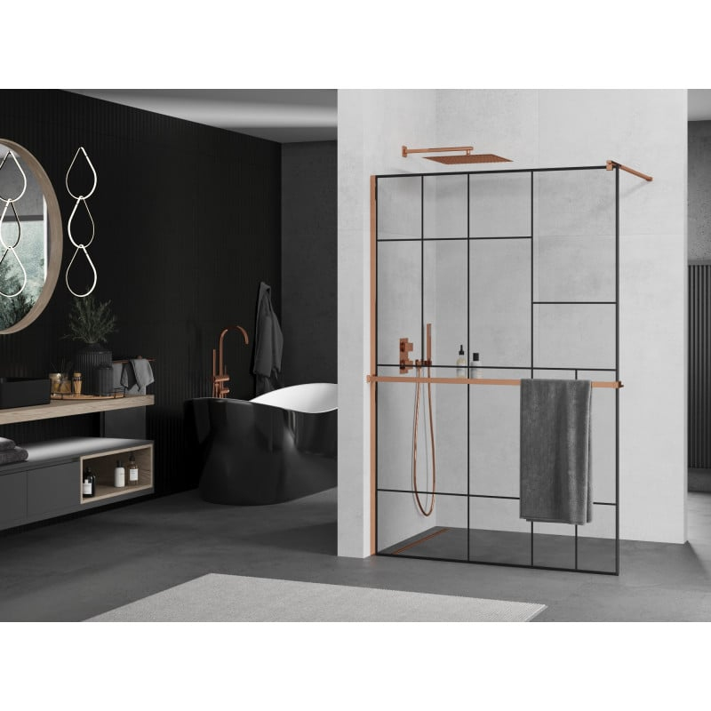 Specifikace produktu: Šířka: 120 cm Výška: 200 cm Montáž: Univerzální, pravá nebo levá Barva skla: Černý vzor Povrchová úprava: Růžové zlato Typ skla: Tvrzené Tloušťka skla: 8 mm Profil: Hliník Konzola: Nerezová ocel Max. délka konzoly: 150 cm Materiál police: Hliník Šířka: 12,9 cm Výška: 3,2 cm Max. délka police: 140 cm Konzolu a poličku lze oříznout Povrchová úprava pro snadné čištění Vyrovnává nerovnosti stěny Lze namontovat na sprchovou vaničku nebo dlaždice