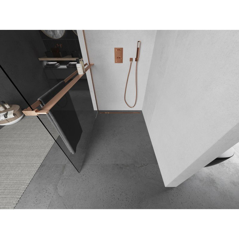 Specifikace produktu: Šířka: 85 cm Výška: 200 cm Montáž: Univerzální, pravá nebo levá Barva skla: Průhledná Povrchová úprava: Kartáčovaná měď Typ skla: Tvrzené Tloušťka skla: 8 mm Profil: Hliník Konzola: Nerezová ocel Max. délka konzoly: 150 cm Materiál police: Hliník Šířka: 12,9 cm Výška: 3,2 cm Max. délka police: 140 cm Možnost zkrácení konzoly a police Povlak pro snadné čištění Vyrovnání nerovností stěny Možnost montáže na sprchovou vaničku nebo obklady