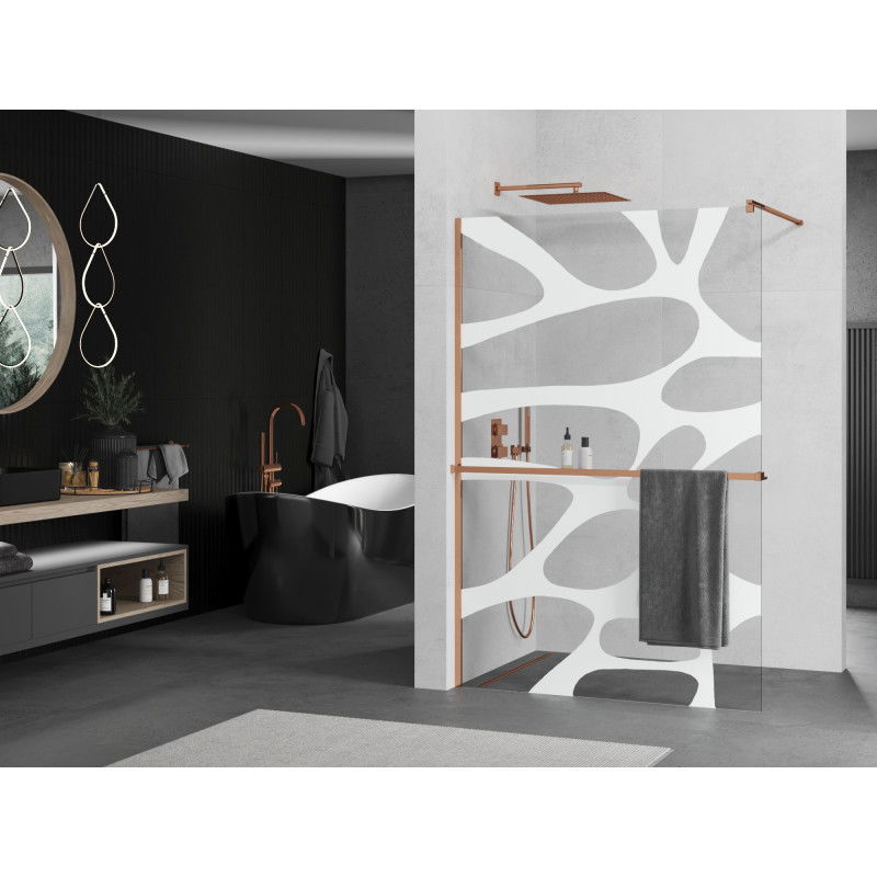 Specifikace produktu: Šířka: 90 cm Výška: 200 cm Montáž: Univerzální, pravá nebo levá Barva skla: Bílá vlna Povrchová úprava: Růžové zlato Typ skla: Tvrzené Tloušťka skla: 8 mm Profil: Hliník Konzola: Nerezová ocel Max. délka konzoly: 150 cm Materiál police: Hliník Šířka: 12,9 cm Výška: 3,2 cm Max. délka police: 140 cm Možnost zkrácení konzoly a police Povlak pro snadné čištění Vyrovnání nerovností stěny Možnost montáže na sprchovou vaničku nebo obklady