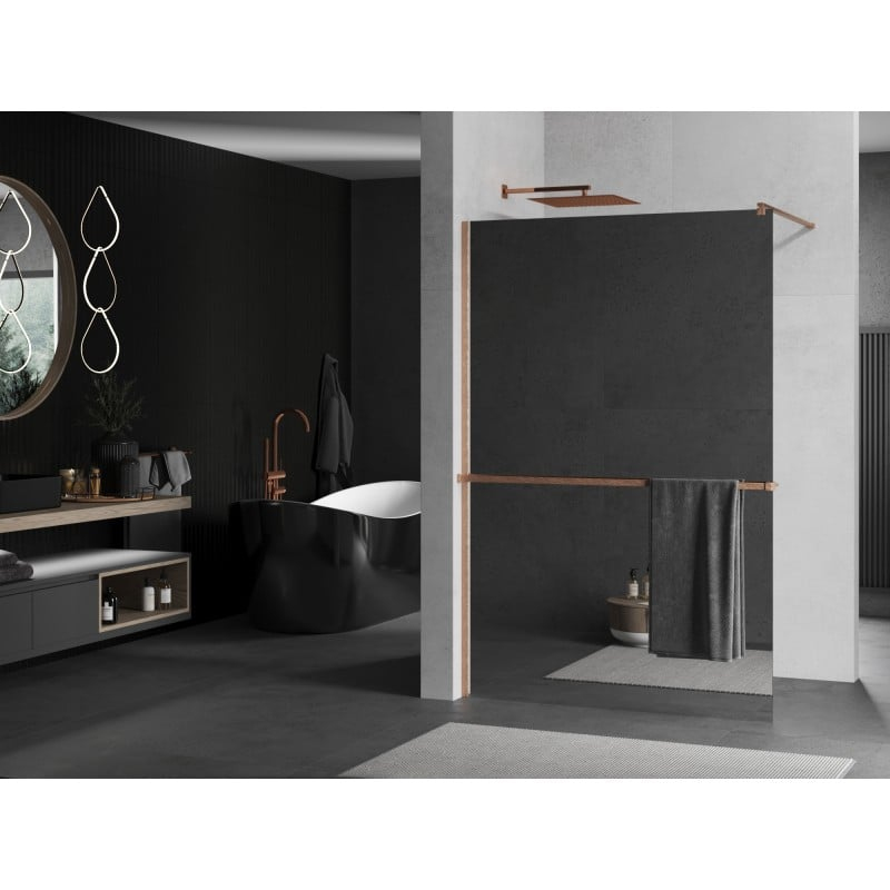 Specifikace produktu: Šířka: 90 cm Výška: 200 cm Montáž: Univerzální, pravá nebo levá Barva skla: Zrcadlová Povrchová úprava: Kartáčovaná měď Typ skla: Tvrzené Tloušťka skla: 8 mm Profil: Hliník Konzola: Nerezová ocel Max. délka konzoly: 150 cm Materiál police: Hliník Šířka: 12,9 cm Výška: 3,2 cm Max. délka police: 140 cm Konzolu a poličku lze oříznout Povrchová úprava pro snadné čištění Vyrovnává nerovnosti stěny Lze namontovat na sprchovou vaničku nebo dlaždice