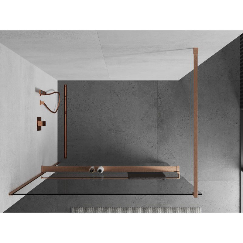 Specifikace produktu: Šířka: 95 cm Výška: 200 cm Montáž: Univerzální, pravá nebo levá Barva skla: Průhledná Povrchová úprava: Kartáčovaná měď Typ skla: Tvrzené Tloušťka skla: 8 mm Profil: Hliník Konzola: Nerezová ocel Max. délka konzoly: 150 cm Materiál police: Hliník Šířka: 12,9 cm Výška: 3,2 cm Max. délka police: 140 cm Možnost zkrácení konzoly a police Povlak pro snadné čištění Vyrovnání nerovností stěny Možnost montáže na sprchovou vaničku nebo obklady
