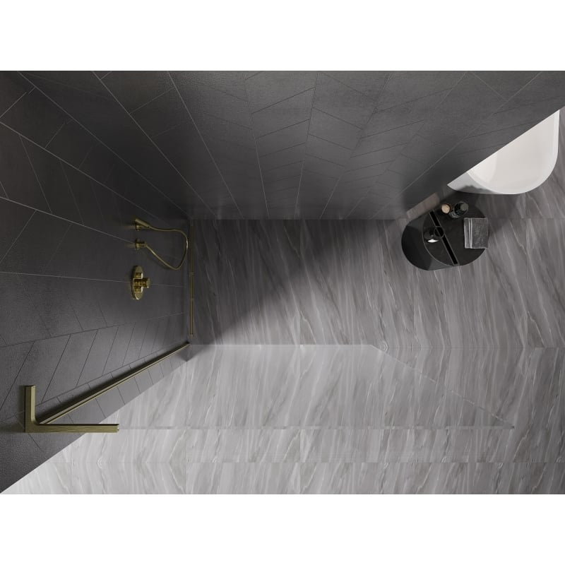 Specifikace produktu: Šířka: 120 cm Výška: 200 cm Montáž: Univerzální, pravá nebo levá Barva skla: Průhledná Povrchová úprava: Kartáčované zlato Typ skla: Tvrzené Tloušťka skla: 10 mm Profil: Hliník Úhlový stabilizátor ve tvaru L: Nerezová ocel Povlak pro snadné čištění Vyrovnání nerovností stěn Možnost montáže na sprchovou vaničku nebo obklady