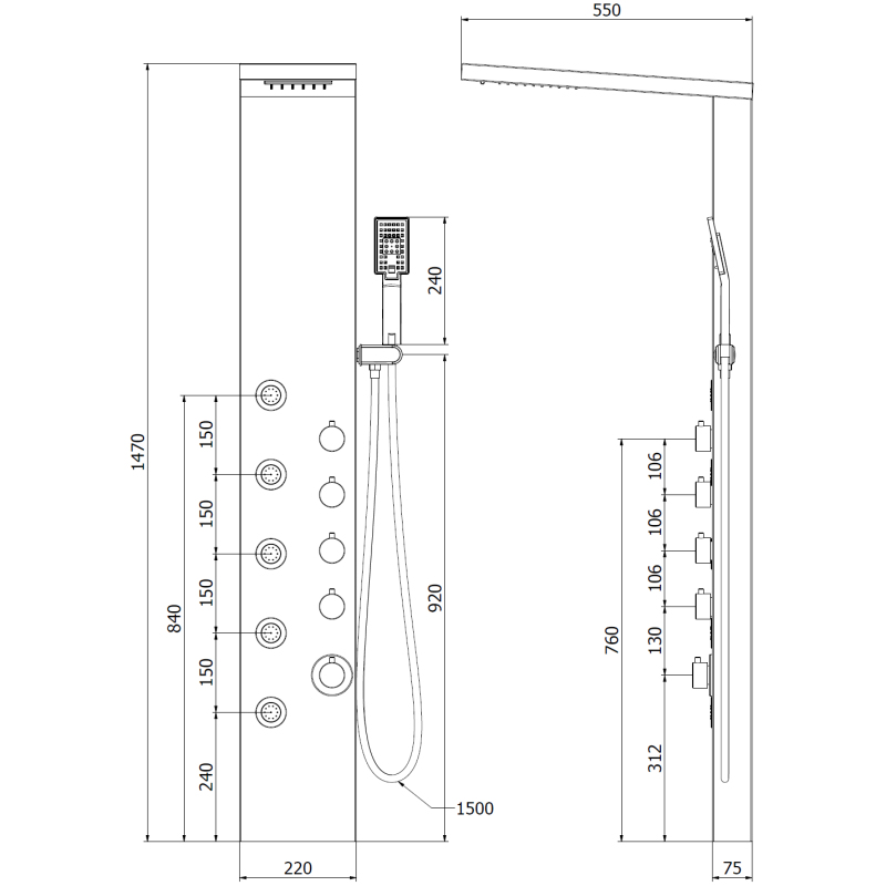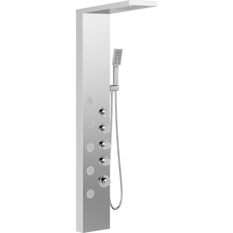 Specyfikacja produktu: Materiał: Stal nierdzewna Kolor: Chrom Wysokość: 147 cm Szerokość: 22 cm Ilość funkcji: 4 Zintegrowana deszczownica Kaskadowy wypływ wody Słuchawka prysznicowa Wąż z osłoną ze stali nierdzewnej 150 cm Dysze silikonowe Anti-Calc ułatwiają usuwanie kamienia Brak możliwości regulacji ciśnienia wody, włączenie i wyłączenie strumienia z funkcją ON-OFF
