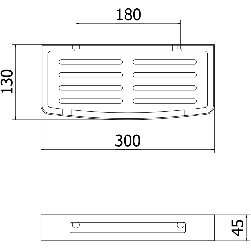 Specyfikacja produktu: Materiał: Stal nierdzewna AISI 304 Wykończenie: Nikiel szczotkowany Szerokość: 30 cm Wysokość: 4,5 cm Odległość od ściany: 13 cm Półka posiada otwory, które zapewniają szybkie odprowadzanie wody Odporność na matowienie i korozję