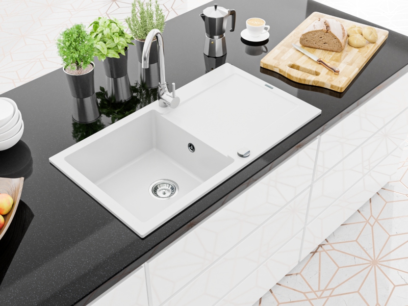 Mexen Leo 1-miskový granit dřez s odkapem a baterií Telma, bílá 6501-20-670200-00