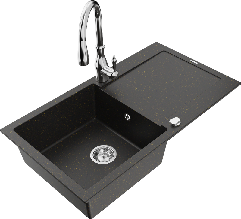 Mexen Leo granit dřez s 1 mísou s odkapem a baterií Savita, černá/zlatá 6501-75-672601-00