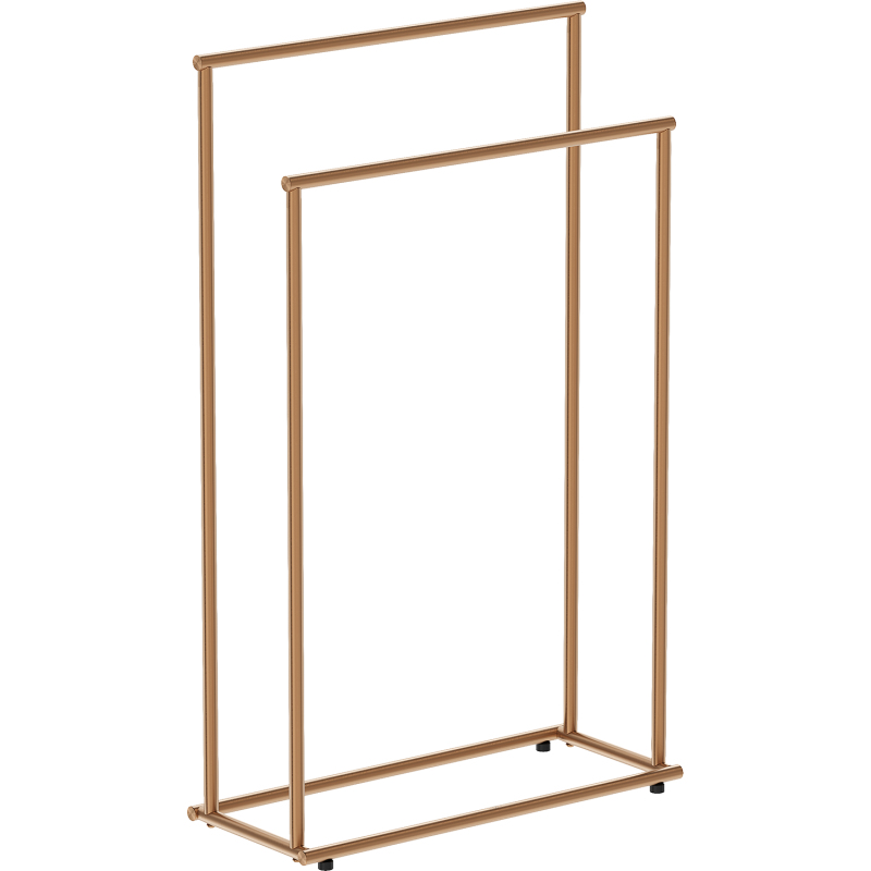 Specyfikacja produktu: Materiał: Stal nierdzewna Kolor: Miedź szczotkowana Szerokość: 50 x 21 cm Wysokość: 82,5 cm 2 drążki na ręczniki o różnej wysokości
