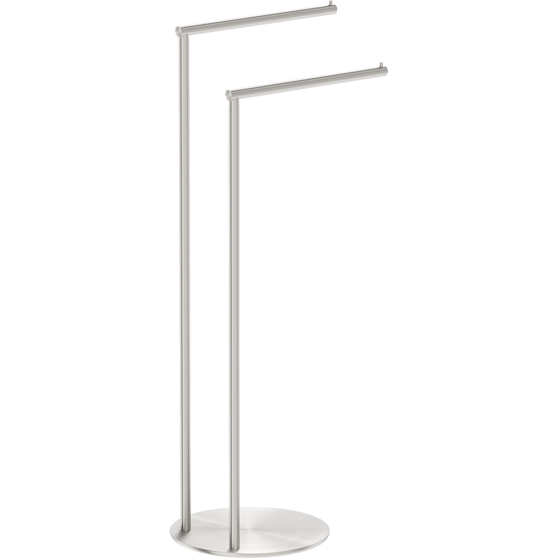 Specyfikacja produktu: Materiał: Stal nierdzewna Kolor: Nikiel szczotkowany Szerokość: 29 x 24 cm Wysokość: 78,5 cm 2 drążki na ręczniki o różnej wysokości