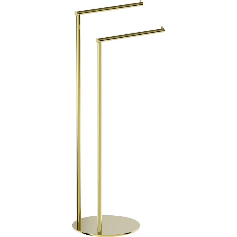 Specyfikacja produktu: Materiał: Stal nierdzewna Kolor: Złoty Szerokość: 29 x 24 cm Wysokość: 78,5 cm 2 drążki na ręczniki o różnej wysokości