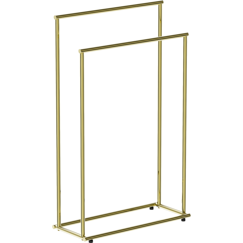Specyfikacja produktu: Materiał: Stal nierdzewna Kolor: Złoty Szerokość: 50 x 21 cm Wysokość: 82,5 cm 2 drążki na ręczniki o różnej wysokości