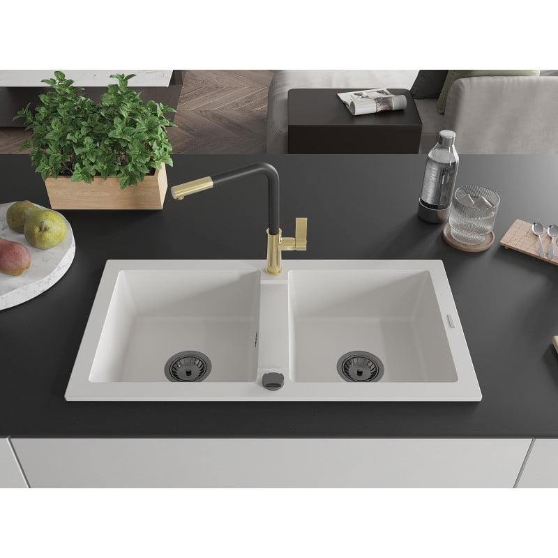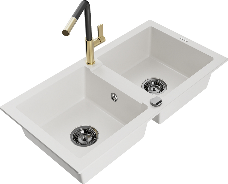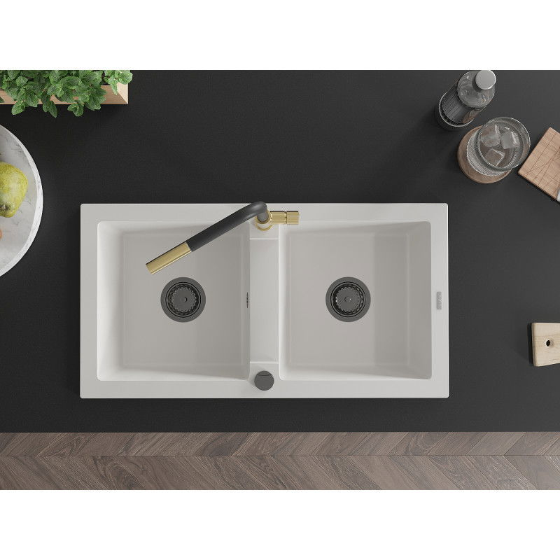 Mexen Mario 2miskový granitový dřez s kuchyňskou baterií Flora, bílá - 6504-20-670401-57-B