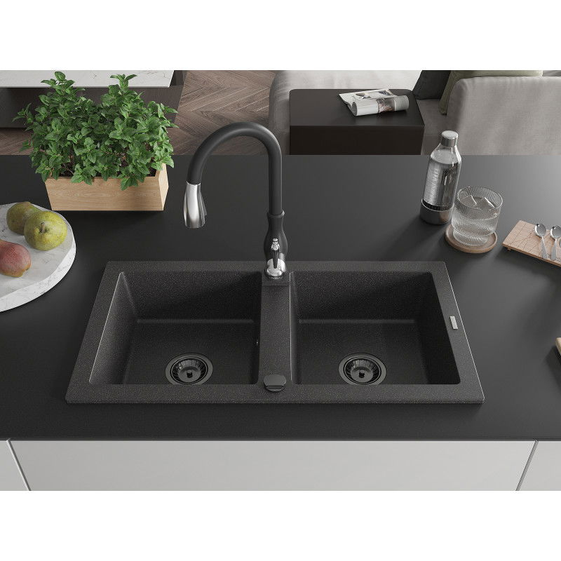 Mexen Mario, 2miskový granit dřez s kuchyňskou baterií Savita, černá 6504-76-672601-70-B