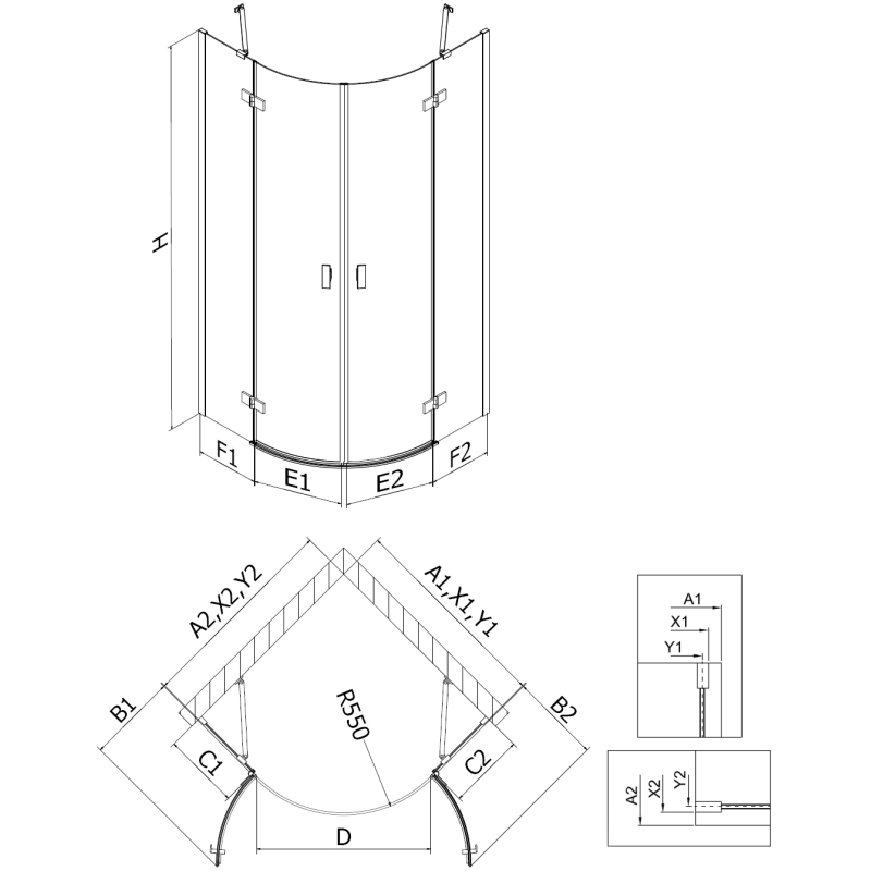 Specifikace produktu: Rozměr: 100x100 cm Výška: 200 cm Poloměr zakřivení R55 Strana montáže: Univerzální Vchod: Dveře s otočnými panty Barva skla: Průhledná Povrchová úprava: Zlatá Profil: Hliník Konzola: Nerezová ocel Typ skla: Tvrzené Tloušťka skla: 6 mm Povrchová úprava pro snadné čištění Nastavitelná šířka Možnost instalace na sprchovou vaničku nebo dlaždice Mechanismus pro zvedání a spouštění dveří Mosazné panty v jedné rovině se skleněnou tabulí Magnetický proužek a elastomerové těsnění pro odvod vody Hliníkový práh těsnění dveří