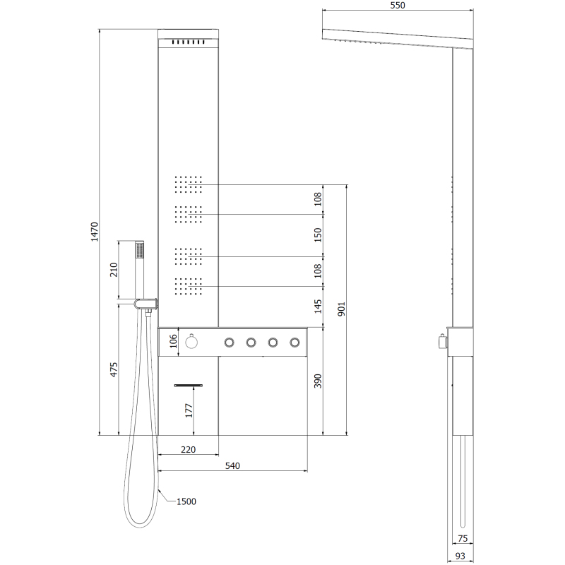 Specyfikacja produktu: Materiał: Stal nierdzewna Kolor: Chrom Wysokość: 147 cm Szerokość: 22 cm Ilość funkcji: 4 Wylewka znajdująca się u dołu panela Praktyczna półka na kosmetyki Zintegrowana deszczownica Słuchawka prysznicowa Wąż z osłoną ze stali nierdzewnej 150 cm Dysze silikonowe Anti-Calc ułatwiają usuwanie kamienia Brak możliwości regulacji ciśnienia wody, włączenie i wyłączenie strumienia z funkcją ON-OFF