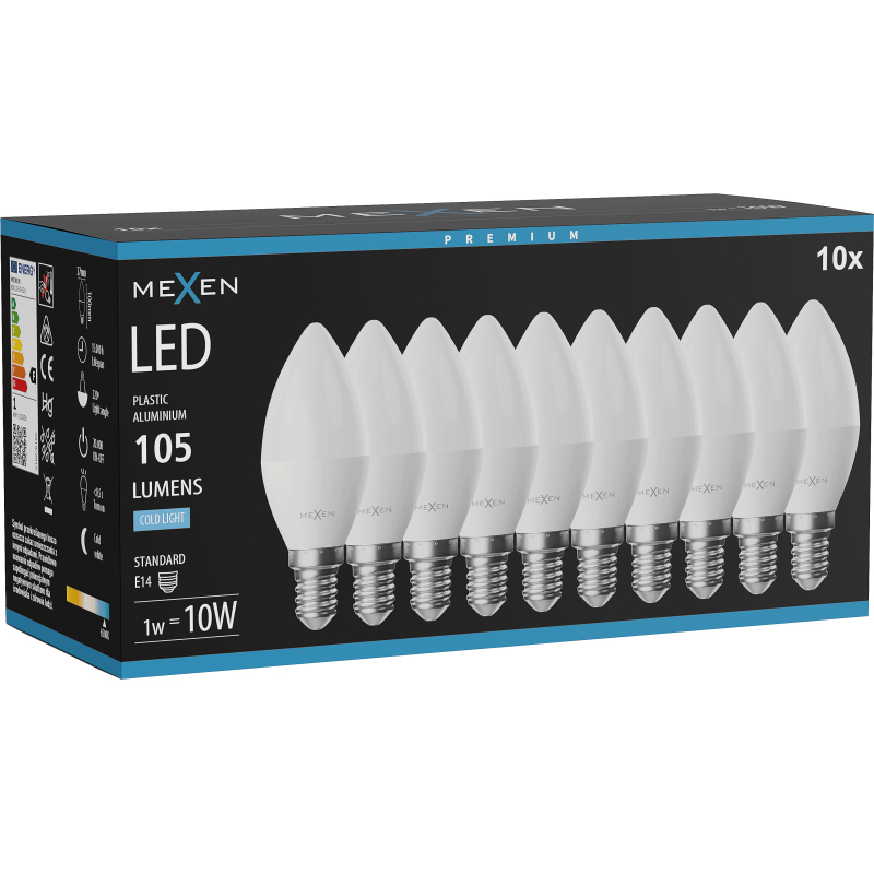Mexen Nova 10x LED žárovka E14, C37, 1W, studená - 6500K, 105 lm - L102-E14-0165-01x10