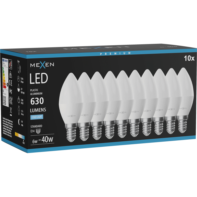 Mexen Nova 10x LED žárovka E14, C37, 6W, studená - 6500K, 630 lm - L102-E14-0665-01x10